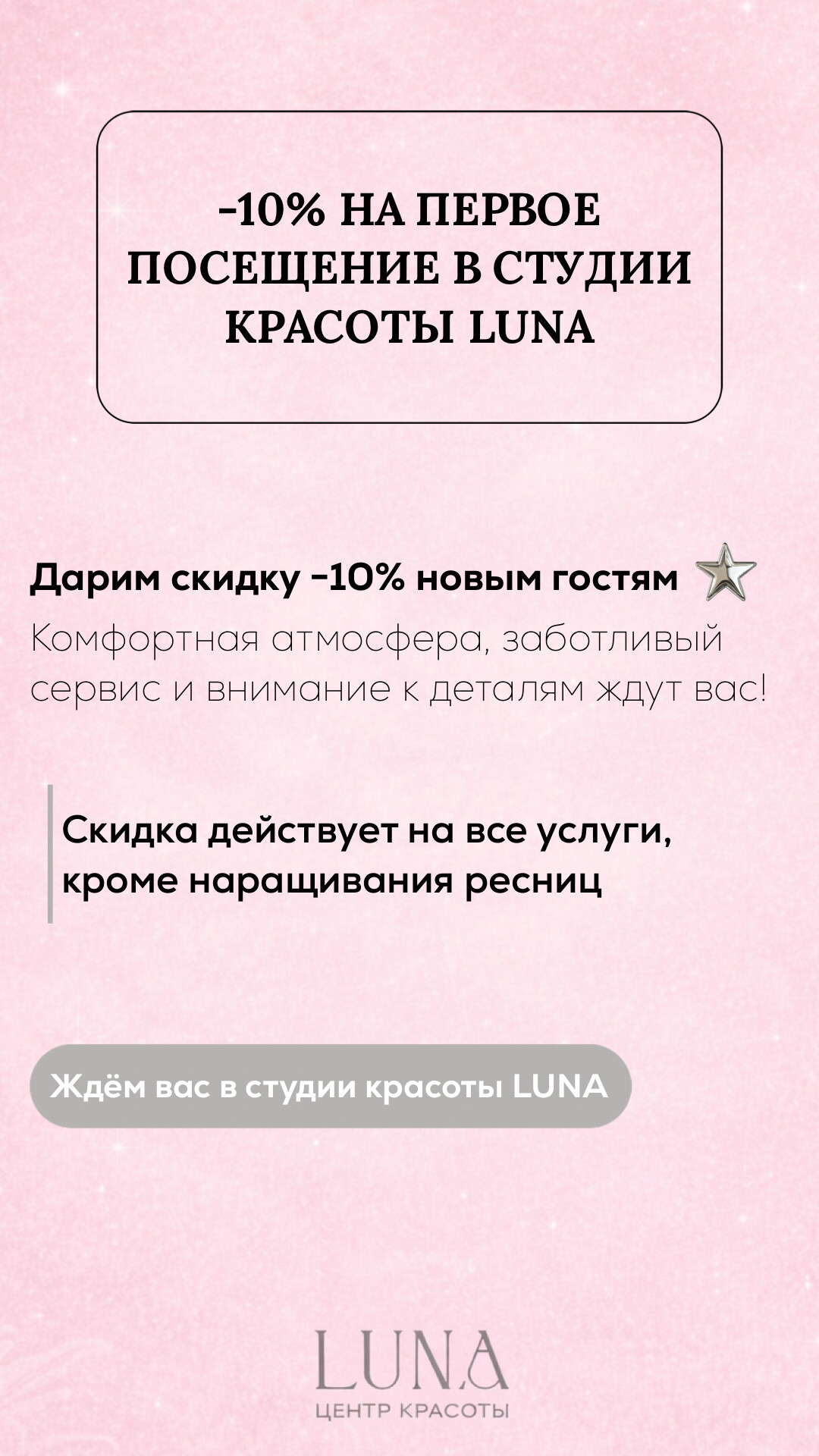 LUNA — мой оазис красоты! Каждый раз, как захожу, будто попадаю в другой мир: тихо, уютно, пахнет аромамаслами. Мастера — настоящие волшебники: маникюр безупречный, массаж снимает стресс, а уходовые процедуры реально работают. Даже маленькие детали радуют — от тёплых полотенец до комплиментов в конце. Если хотите почувствовать себя красивой и расслабленной, вам сюда!